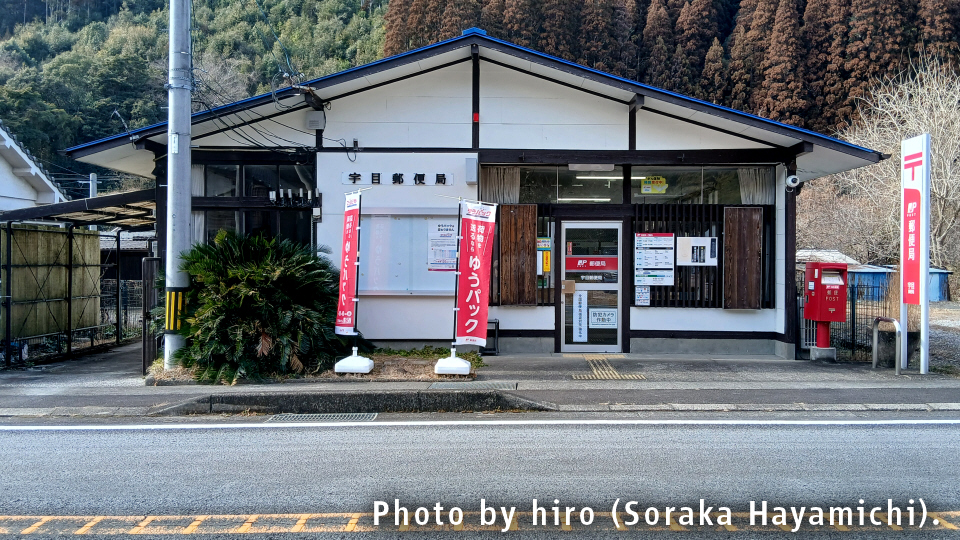 - 備考:合併前の旧・宇目町に設けられた郵便局で、同町内の集配業務を行う。宇目町単体だけで非常に広大な面積を誇ることから、ほぼ中間部の小野市地区から持ち運ぶ方が効率よいからか。