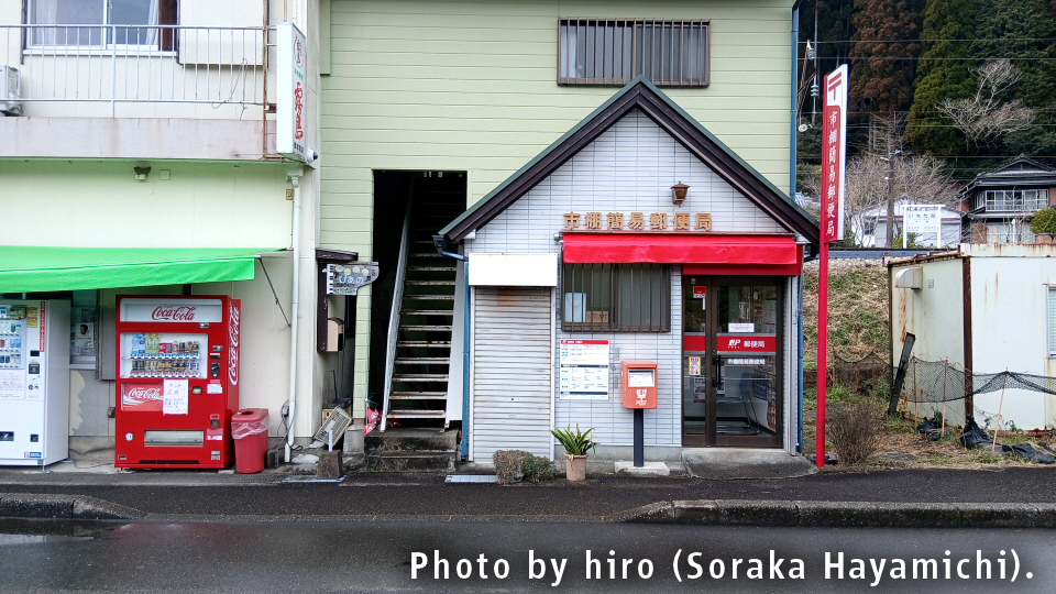 - 備考:北川沿いの集落にある簡易郵便局。近くを通る国道326号を少し北に進むと、すぐに大分県に入る。