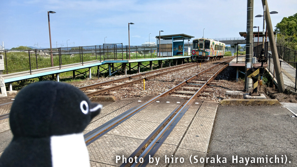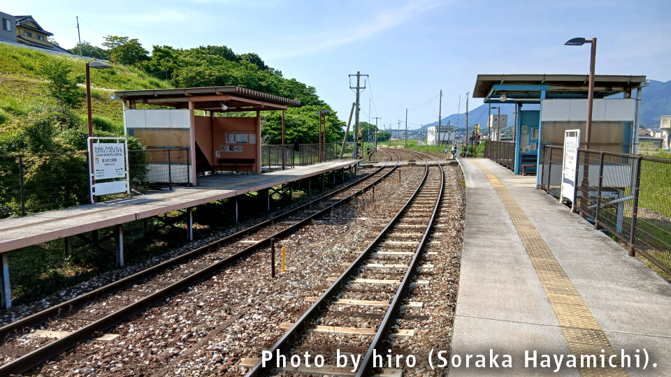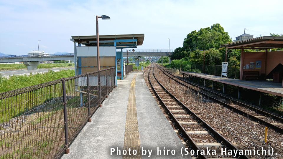 駅構内を眺める。駅舎は無く、踏切を隔てて上下線で異なる出入口からホームへ向かう構造を採る。