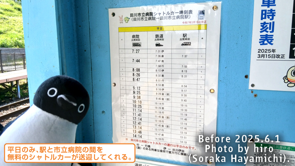 そのため、列車運行に合わせる形で病院側がシャトルカーを運行し、患者の通院送迎を行っている(平日のみ)。