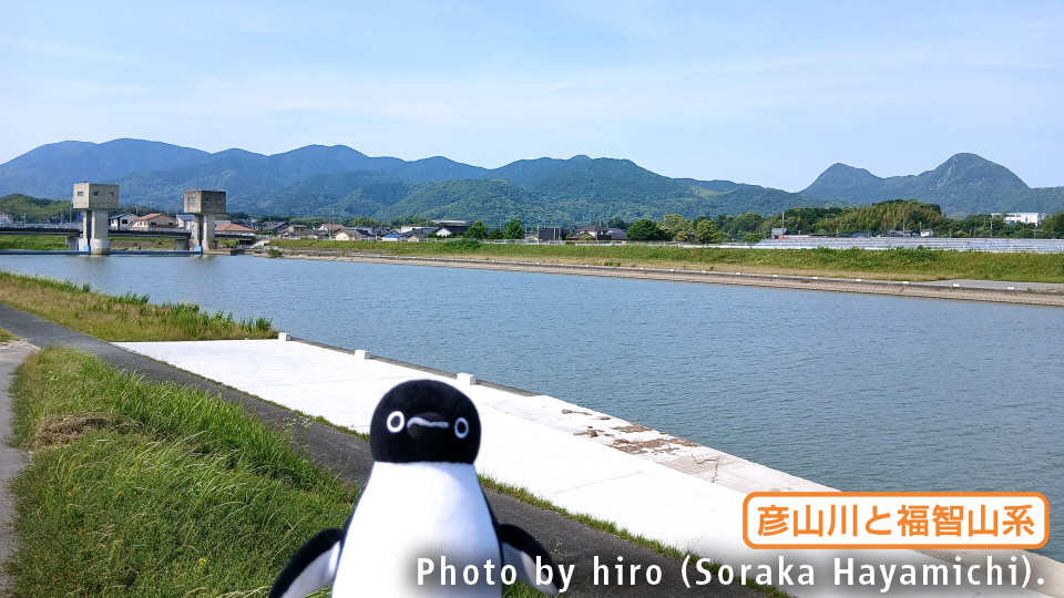 駅前を流れる彦山川と福智山系の様子。だいぶ田川に近づいた感がある。