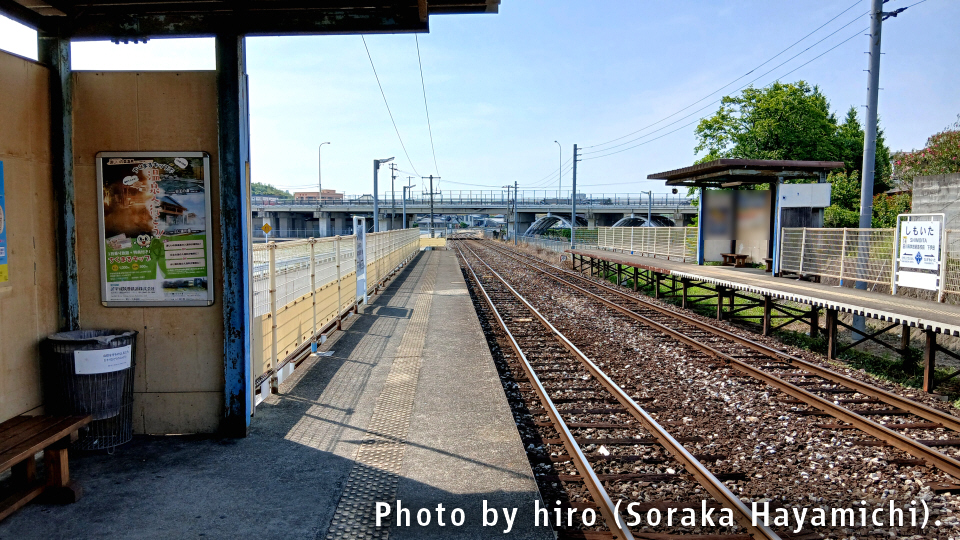 駅構内を眺める。やはり駅舎はなく、上下線それぞれに設けられた階段・スロープを経て、直接ホームに乗り込む。
