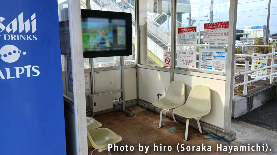 簡易駅舎内にはベンチと運行情報パネルがある。自販機もあるので、暇つぶしには最適だろう。