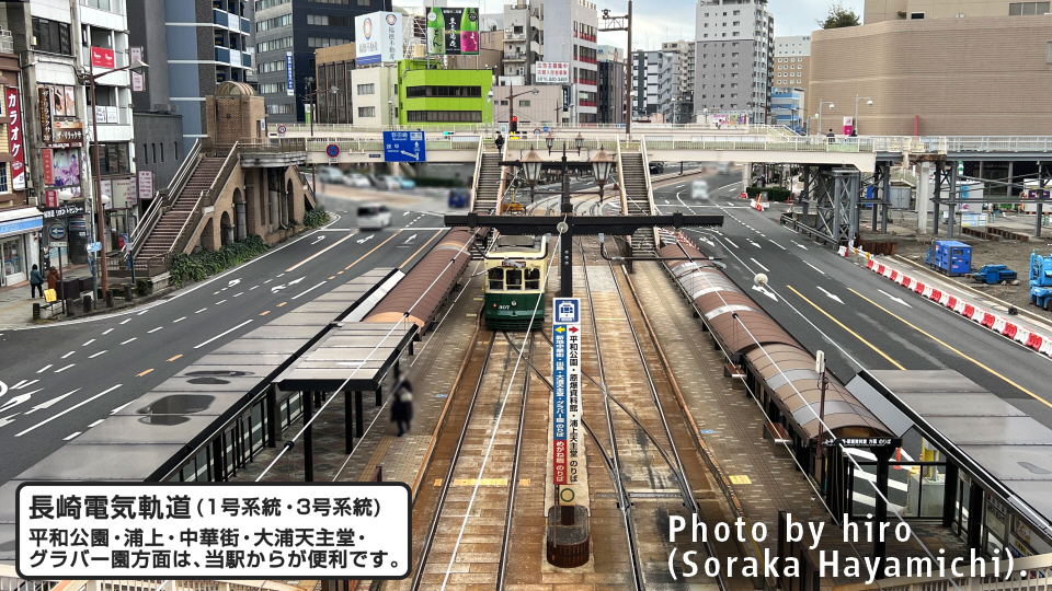 長崎市内を走る路面電車は従来と同様。かもめ口から連絡橋などを経て、路面電車のホームへ向かう。