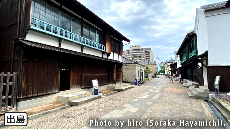 当駅のやや南に、鎖国時代に当時のオランダと貿易を行っていたとされる出島(再現)が立地。有料で見学できる。