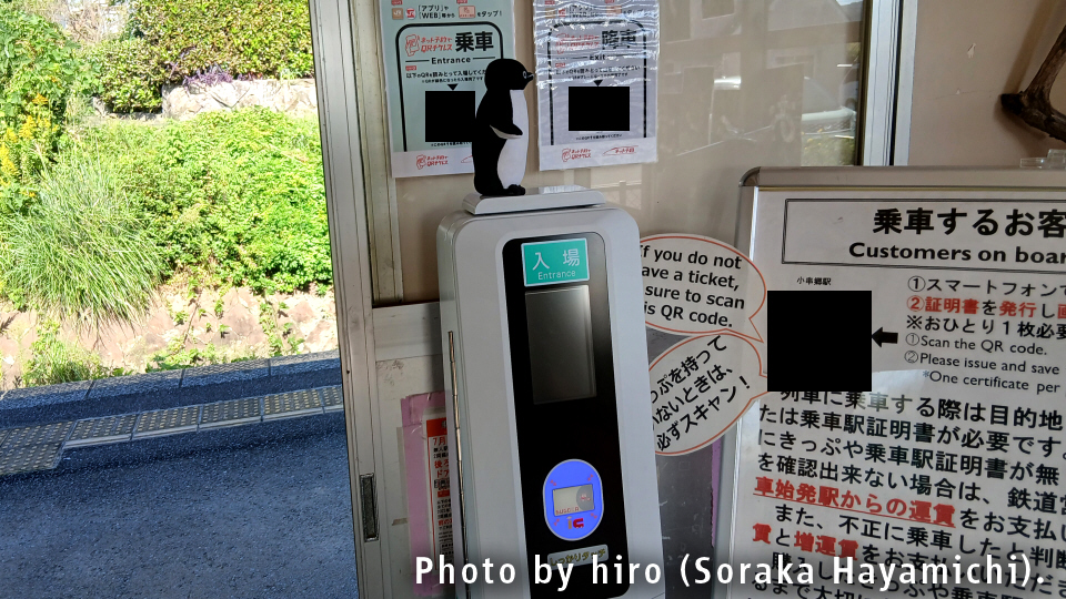 ホームに繋がる改札口付近に、簡易式カードリーダーとQRチケレスのポスター改札が設けられている。