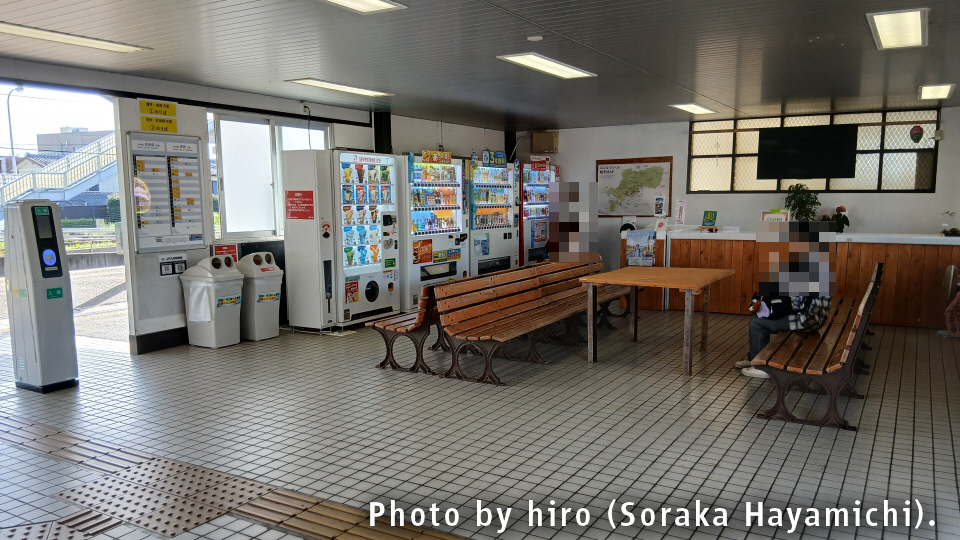 川棚町中心部最寄り駅だけあり、自動販売機と待合スペースを確保している。