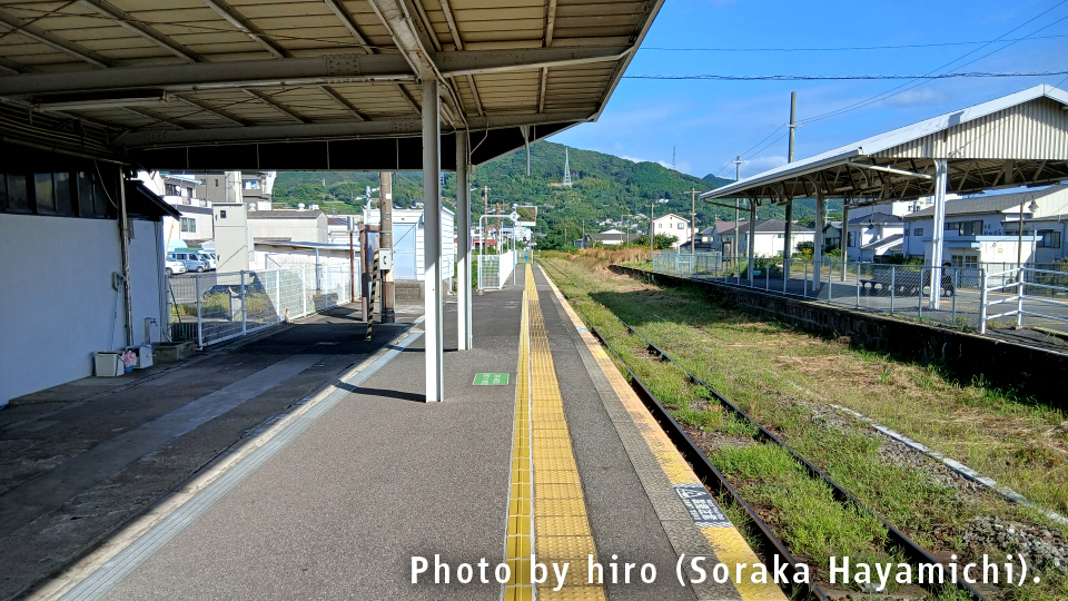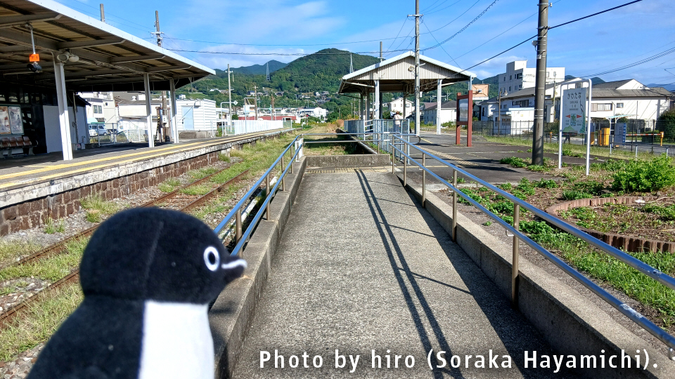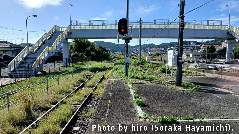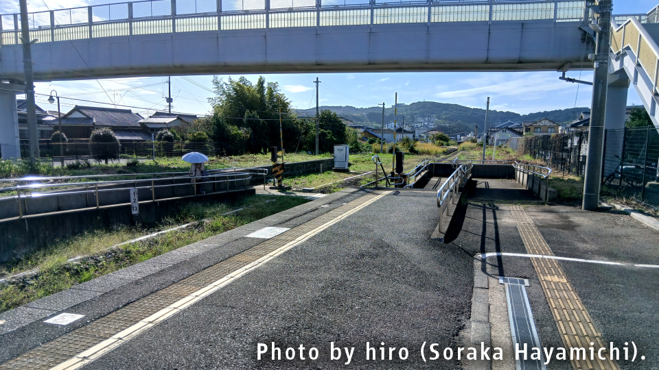 構内踏切の上空を通過している跨線橋は、川棚町の自腹で建てられた自由通路。