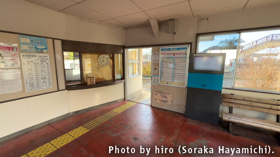 駅舎内を眺める。古い木造建築の建物で、中身は木製ベンチと情報案内板がある。