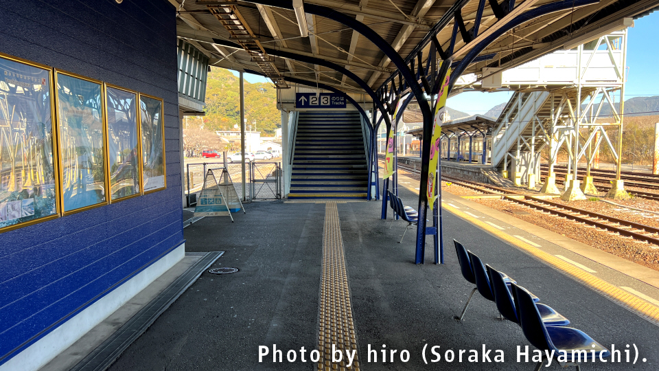 1番のりばの跨線橋裏には、かつての切りかけホームとみられる痕跡が残されている。