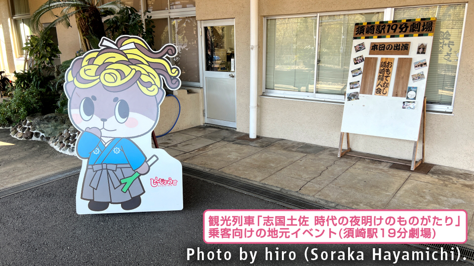 観光列車「志国土佐 時代の夜明のものがたり」が当駅に停まるため、そこで乗客向けのイベントを1番のりばで行う様子。
