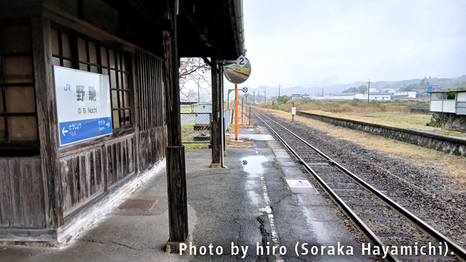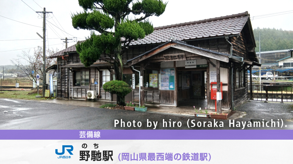 野馳(のち)駅は、岡山県新見市哲西町畑木字キシ添に設置されている、芸備線の駅。岡山県最西端の鉄道駅であり、限りなく広島県との県境に近い。