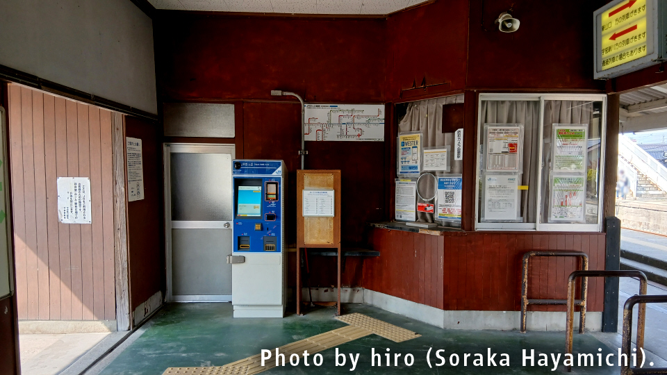 駅舎内を眺める。木造建築の建物であり、昔は窓口業務を行っていた痕跡が残る。