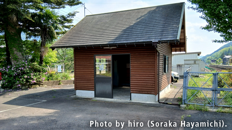 駅構内を眺める。自治体が設置したログハウス風の待合室を、樹木の真下に設けている。