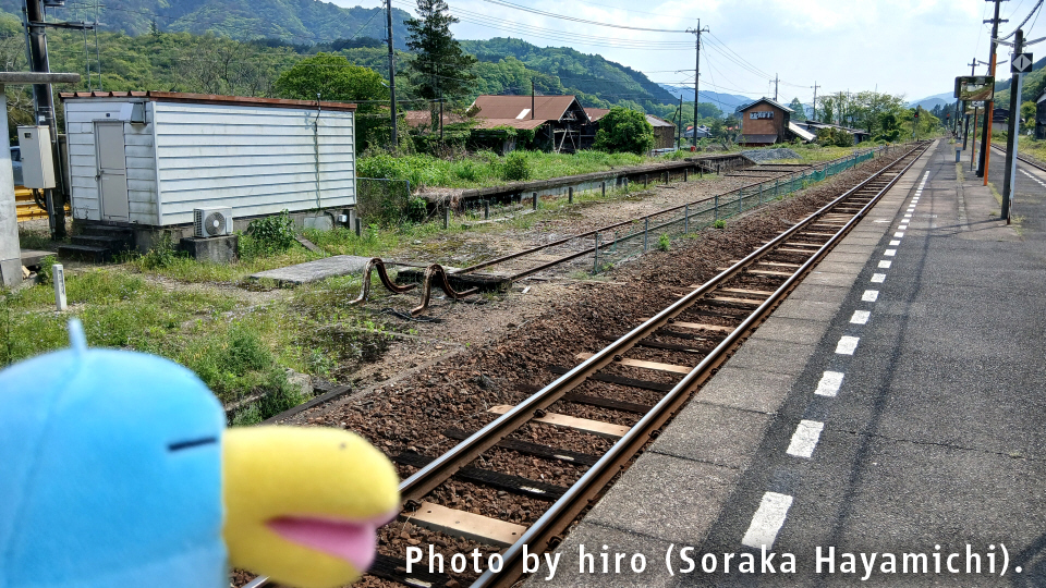 駅の東寄りに、使用されていないホーム跡が残されていた。昔は荷物・貨物事業を行っていたのかな?