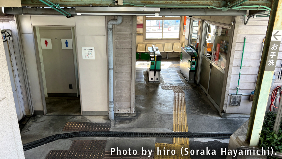 ホームから改札口を眺める。通路の隣に、昔ながらのトイレがある。