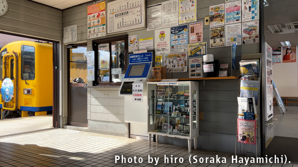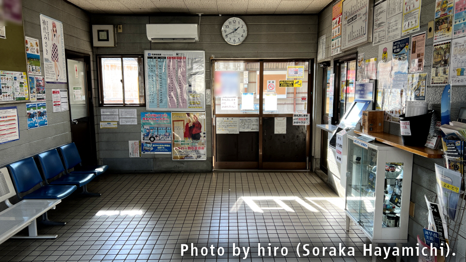 駅舎内を眺める。2階平屋建ての建物の中に、待合室・有人窓口がそれぞれ設けられている。