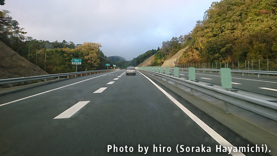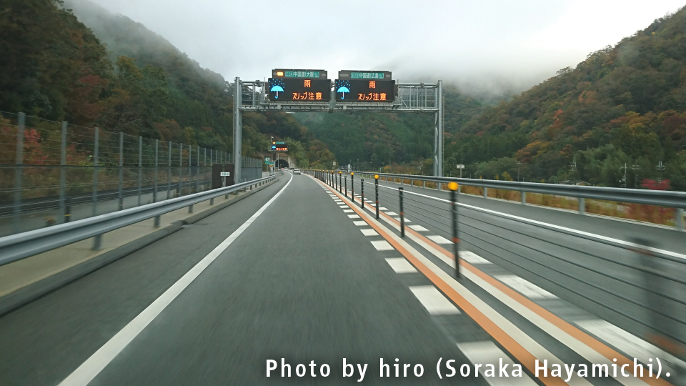 山間部を縫うように突き進む、例の高速道路。宍粟JCTからE29鳥取道までは約15分程度の距離。