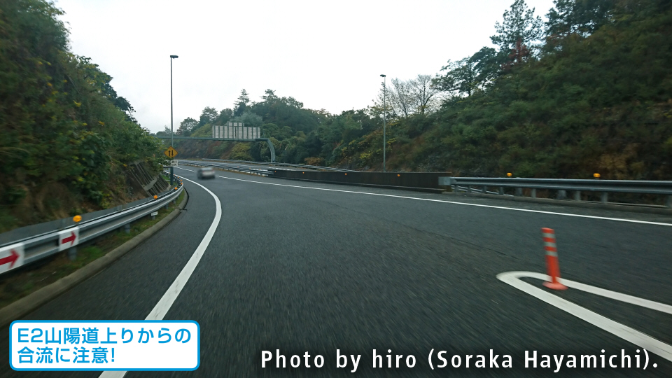 本線と立体交差して、E2山陽道上りからの車線と合流する。