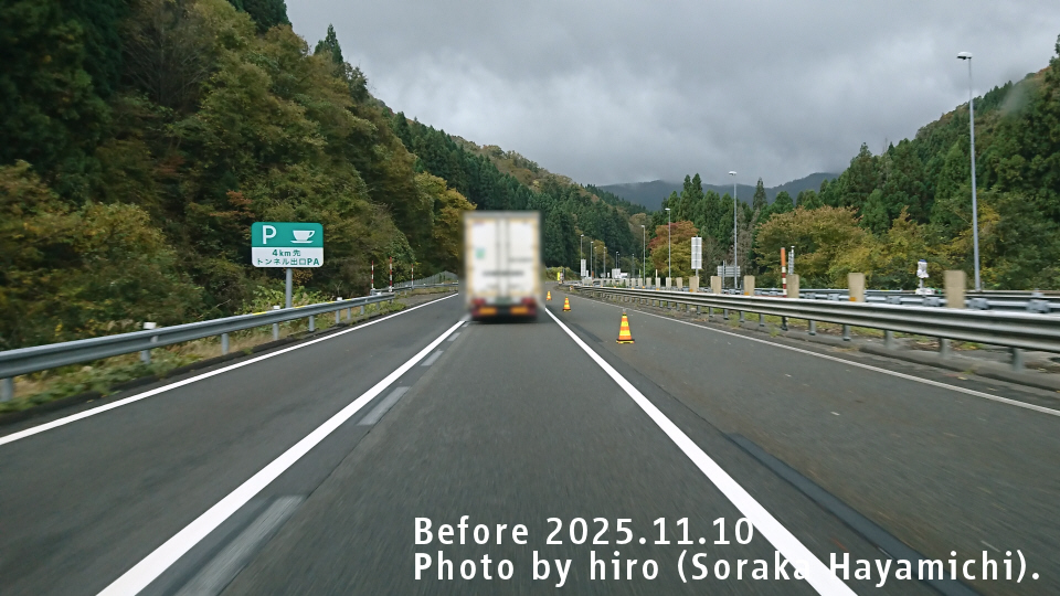 敦賀トンネルを抜けた先に休憩施設がある。事前告知の標識は珍しいかも。