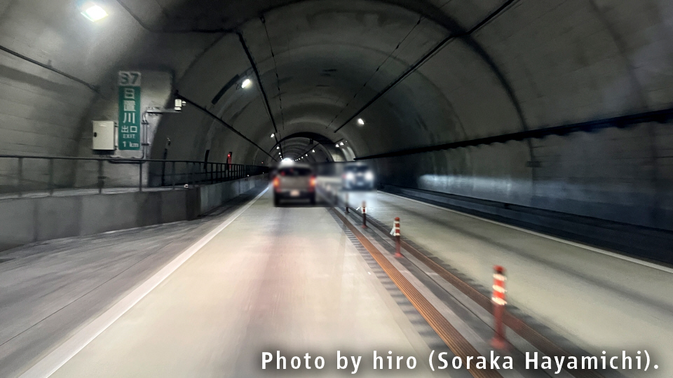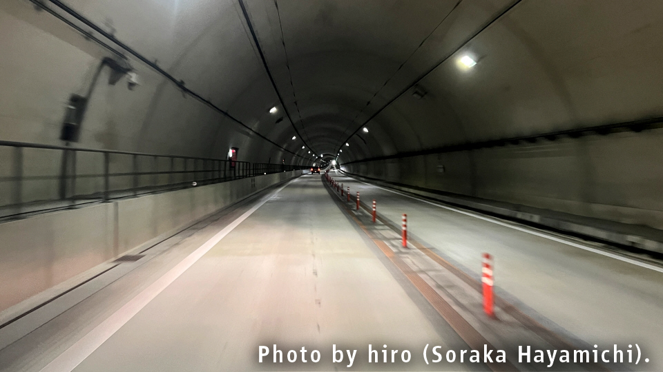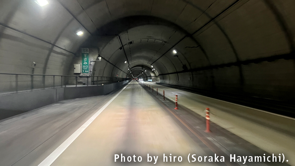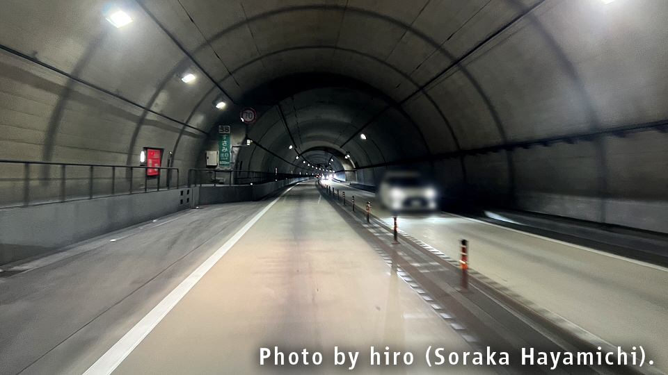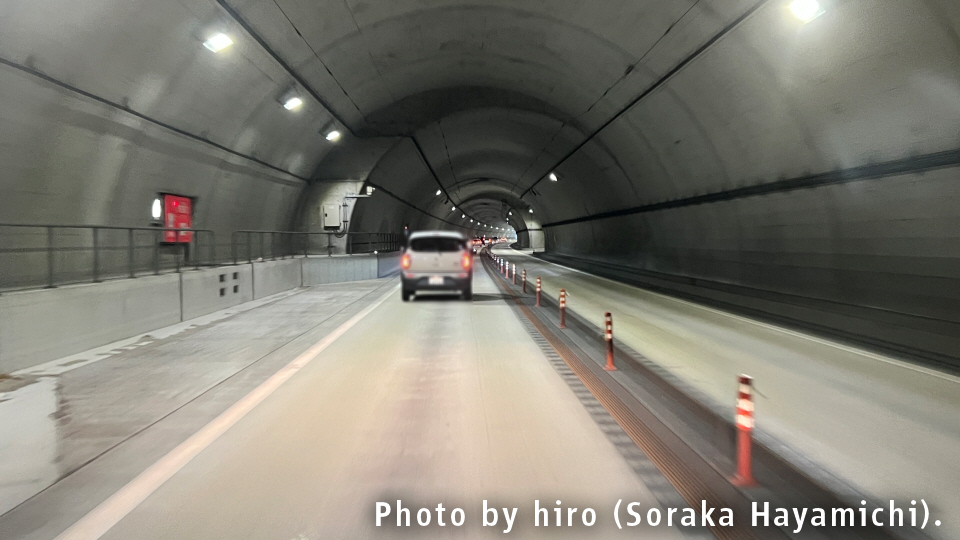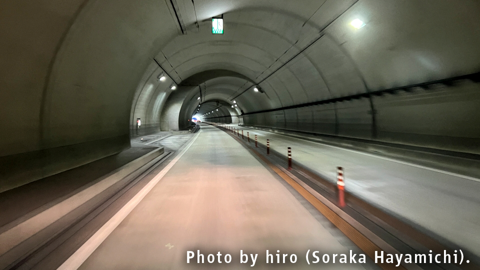 周参見第2トンネルは、出口まで終始、下り坂が続いている。速度超過とか起きやすいのでは?