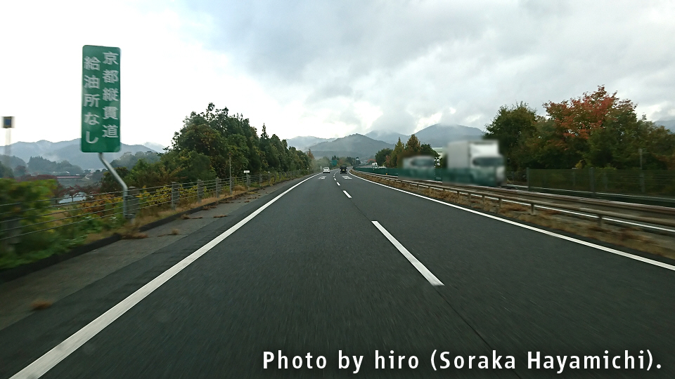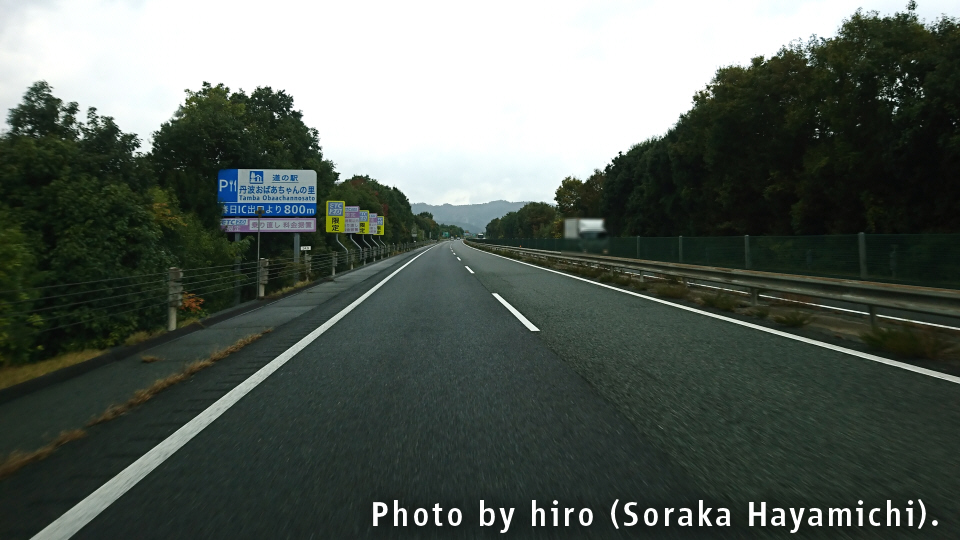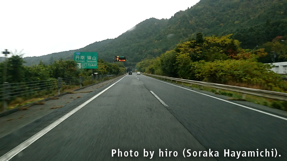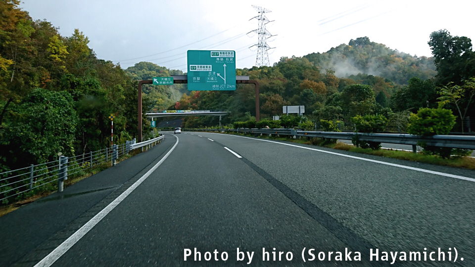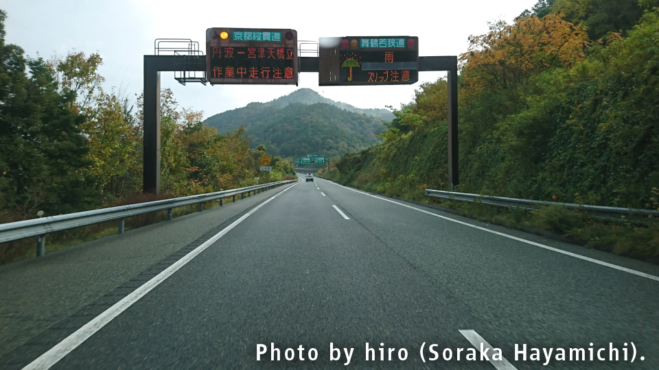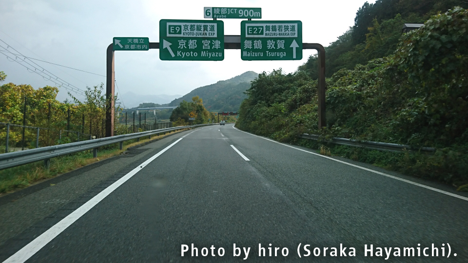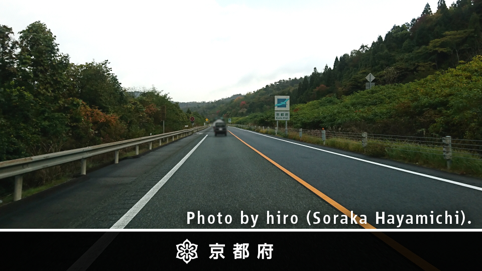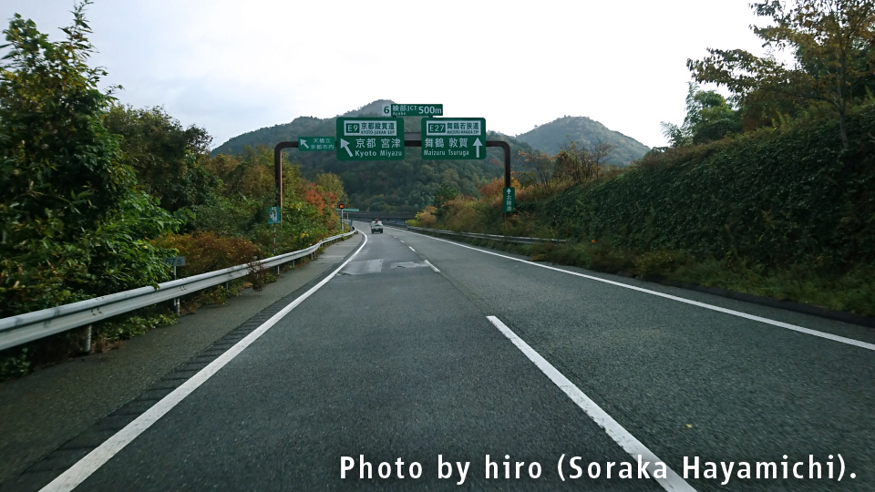 京の都に入るが、E27舞鶴若狭道は昔の丹波国・丹後国(京都府北部+兵庫県北東部)をタテ方向に縦断するルート。