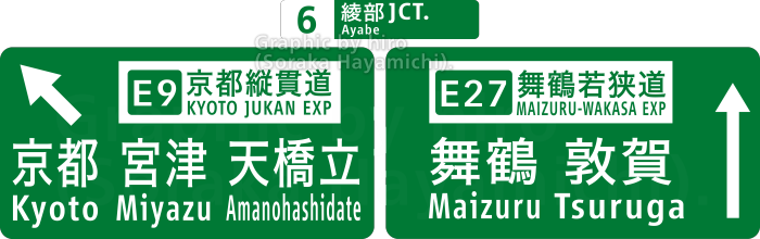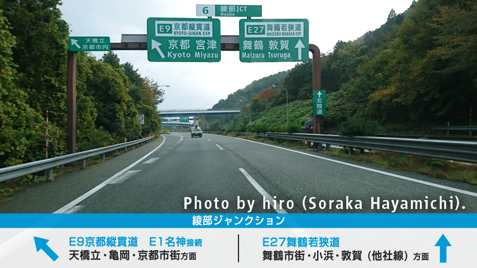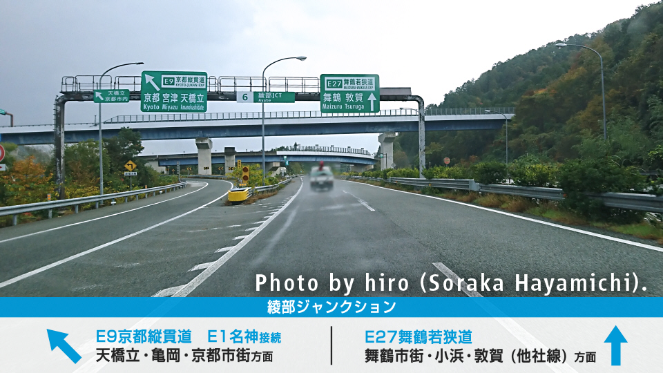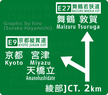 E9京都縦貫道と合流する。宮津・天橋立・亀岡・京都市街(洛中)方面はコチラへ。