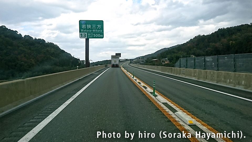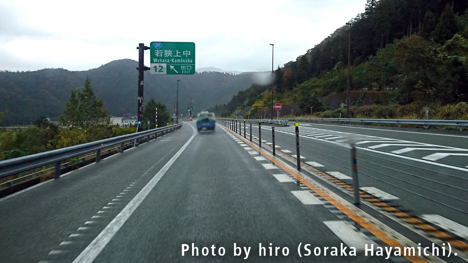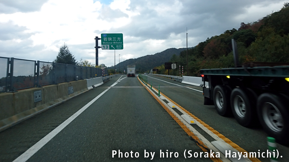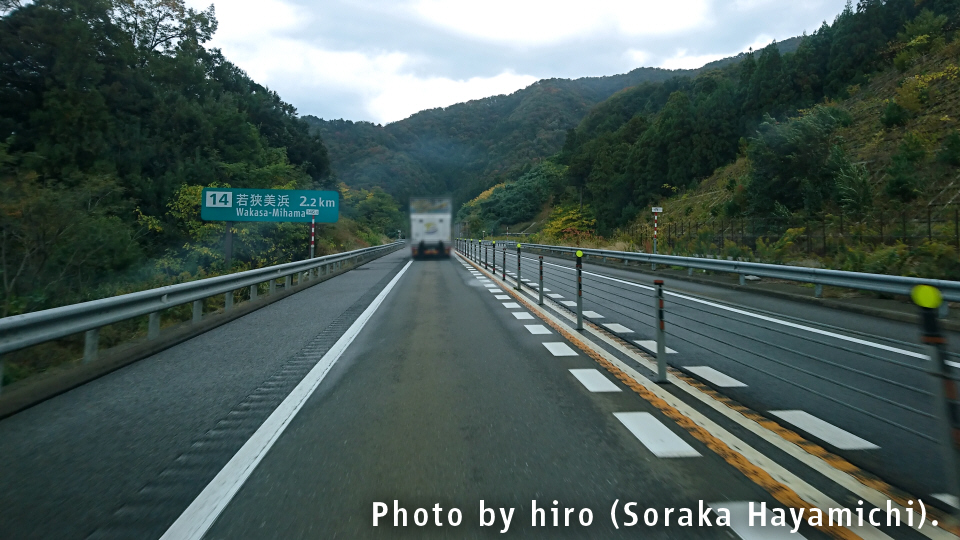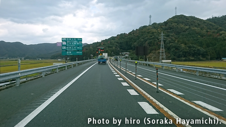 並行する国道27号とJR小浜線は、更に内陸寄りの旧・上中市街を通過しており、高速道路とは離れている。
