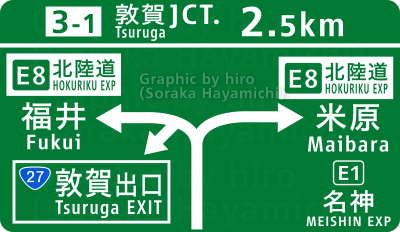 ランプウェイの道中に、E8北陸道本線とは別枠で敦賀インター出口案内を設ける。