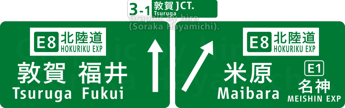 E8北陸道が接近するため、下段部の案内が福井方面・米原方面に切り替わる。