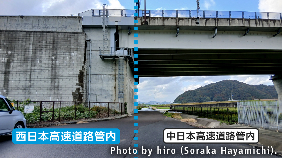 当インターを境にNEXCO西日本とNEXCO中日本が入れ替わり、当インターはNEXCO西日本が管理している。会社境は東側の北川橋の床版を取り付けるアンカーブロック付近。