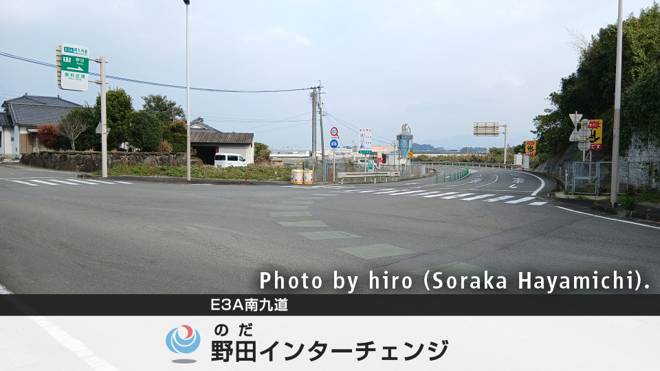 - 解説:出水市と合併する前の旧・野田町に設けられたインターチェンジ。周辺は住宅街が密集した小高い丘が形成されている。出水市役所野田支所や野田郷駅といった市街地は、当インターを南下した所にある。