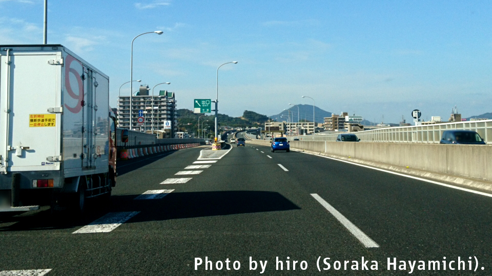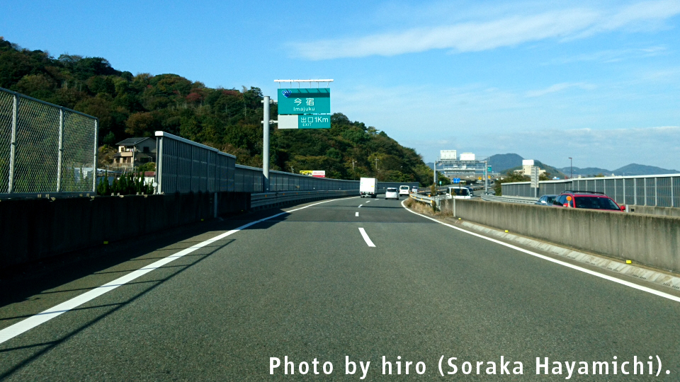 以前からある今宿バイパスに並行する形で自専道が整備されたため、高架構造の割に急カーブが目立つ。
