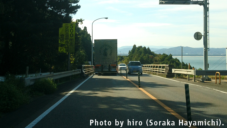 玄界灘沿いを走る。交通量が多く、流れが悪くなりやすいが、現段階で拡幅する予定は無い。