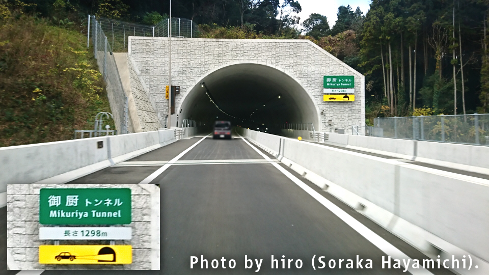 次のトンネルが合流車線の直後にあるため、道路表示板をインターを通過する途中に設けている。