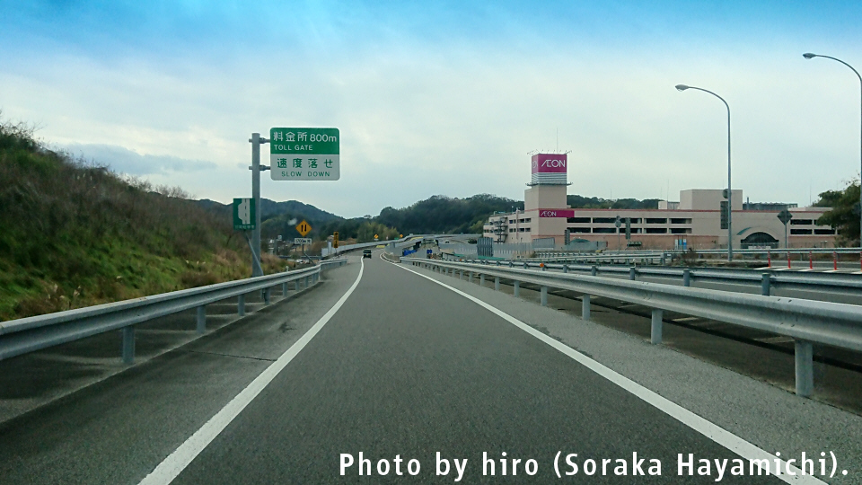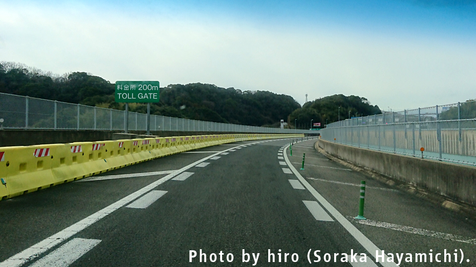 料金所の先で、佐世保大塔インターからのランプと合流する。側道部の国道35号バイパスが見渡せる。