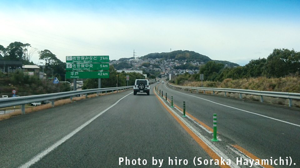 佐世保市街に入ったため、下段部の案内が平戸までの距離に変化する。