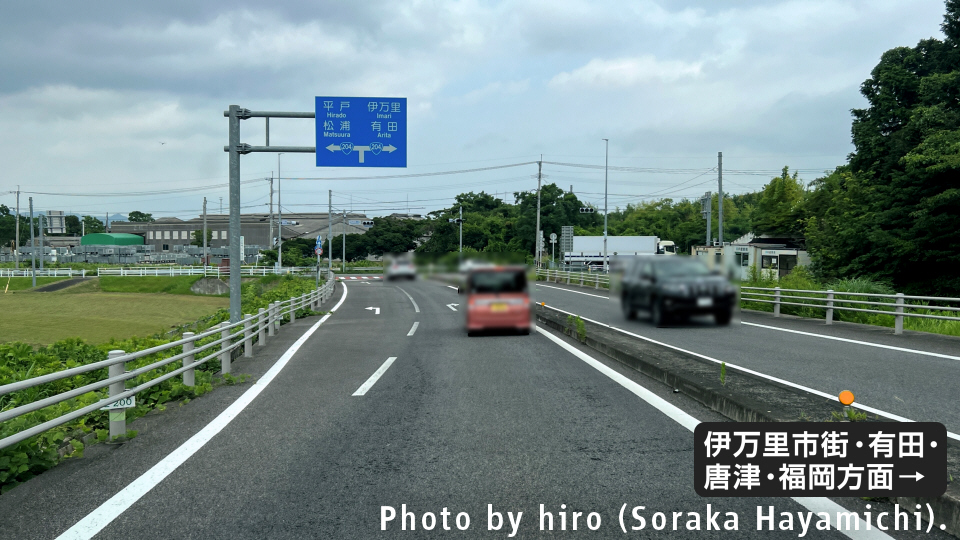 国道204号と合流する。伊万里市街・唐津方面は右折。