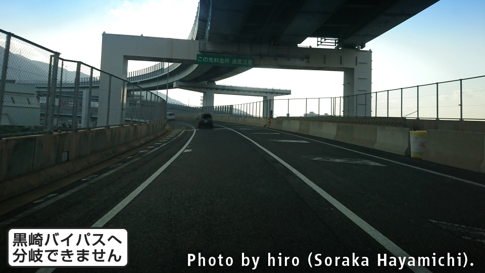 大きく左にカーブする所で、右側に黒崎・陣原方面へ分岐する黒崎バイパスの「イカの耳」が見える。