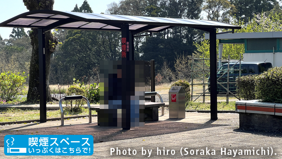 身障者・二輪車向け駐車場の奥手に喫煙スペース。車庫入れに使うカーポートをそのまま流用している。