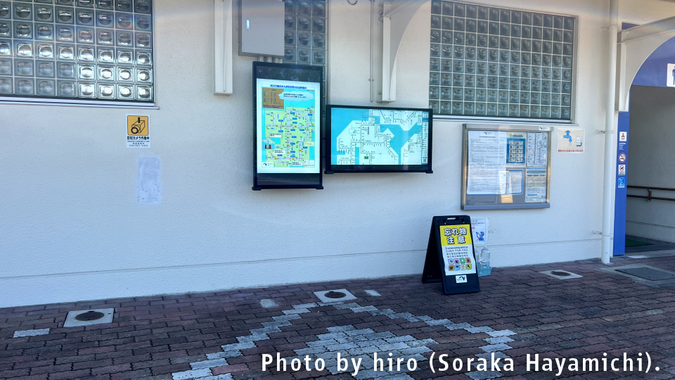 男女トイレの真ん中壁面に、デジタルモニター方式の掲示板・ハイウェイ情報ターミナルがある。
