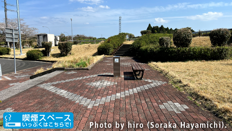 喫煙スペースは入口通路寄りに野晒しで設けている。