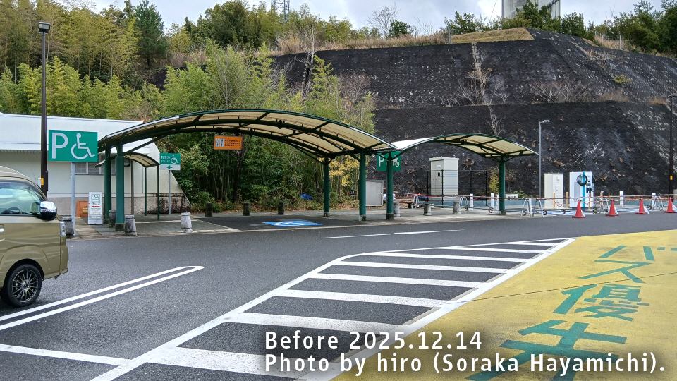 トイレの脇に身障者・二輪車向けの駐車スペースを確保。隣でEVスタンド増強工事を行っていた。