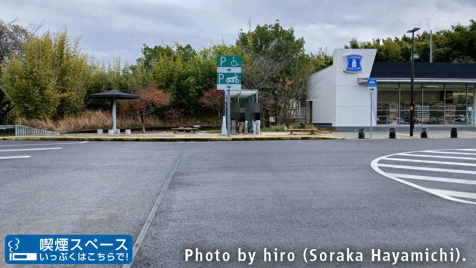 コンビニの隣・入口通路沿いに喫煙スペース。