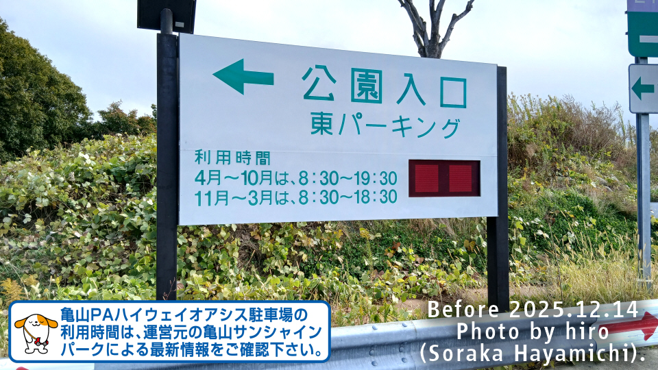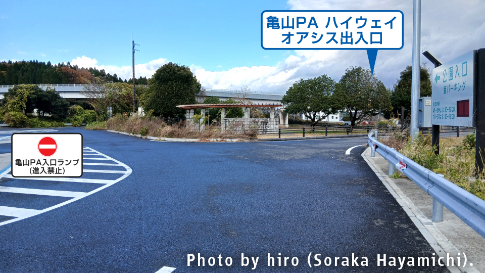 入口通路の近くに、西側に広がる亀山サンシャインパーク(広域公園)と繋がるハイウェイオアシスの出入口がある。