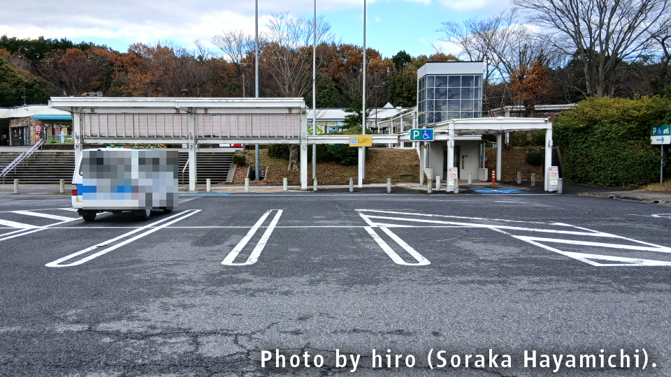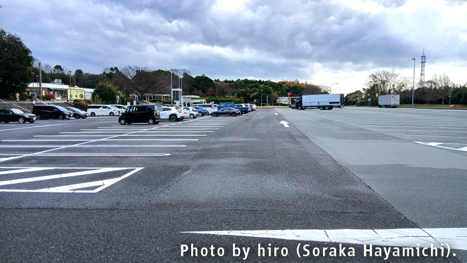 入口通路沿いから駐車場を一望する。サービスエリアらしく、小型車優先の駐車レイアウトを成す。