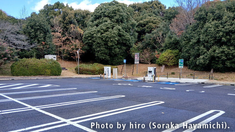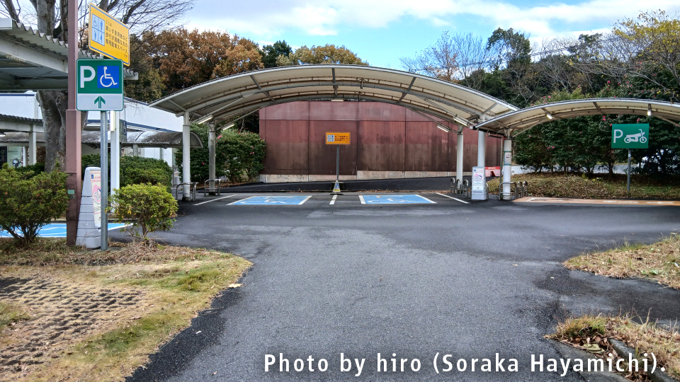 トイレ脇の高台に設けられた身障者・二輪車向けの駐車場。
