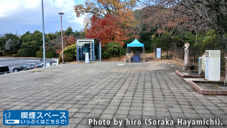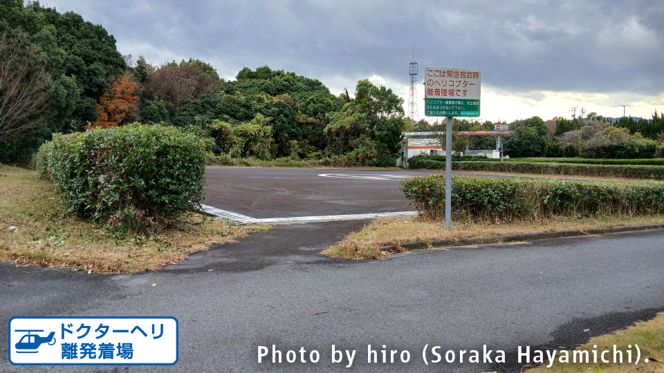 高台に設けられた身障者・二輪車向け駐車場とガソリンスタンドの隣に、ドクターヘリ用の離着陸場がある。
