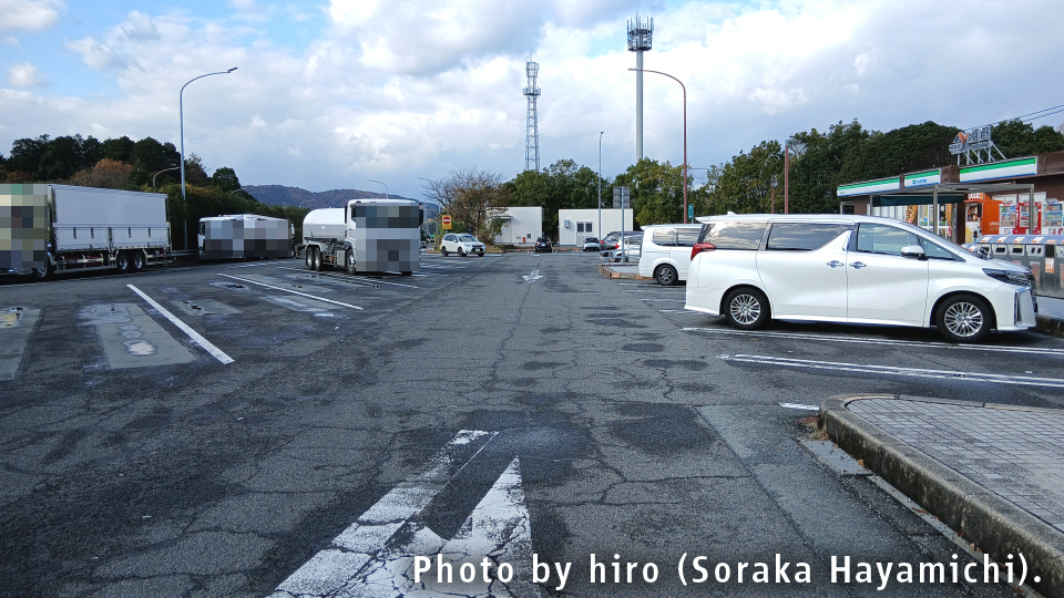 コンビニ前に小型車駐車場があり、その後ろに大型車向けのマスを確保している。