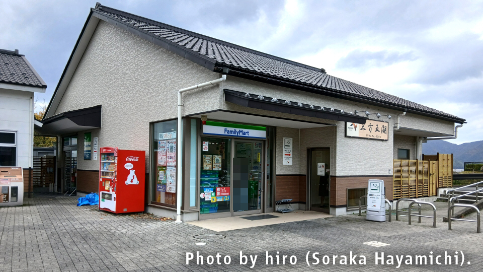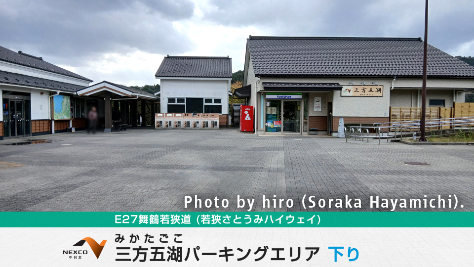他社線と異なり、三方五湖PAは24時間営業のファミリーマートが入居。上下線どちらからも利用できる。